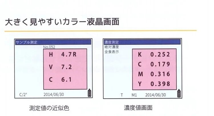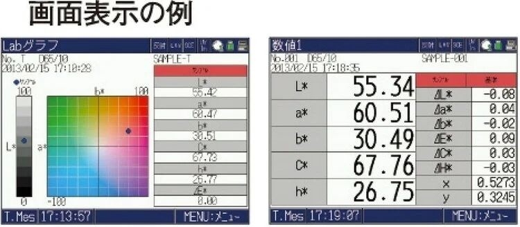 | 表示画面 | 各数值画面,色差值,基准值,Metamerism, Yxy图表, Lab图表, CDA图表, 一览画面,近似色(可任意变更各画面表色系和测定项目) |