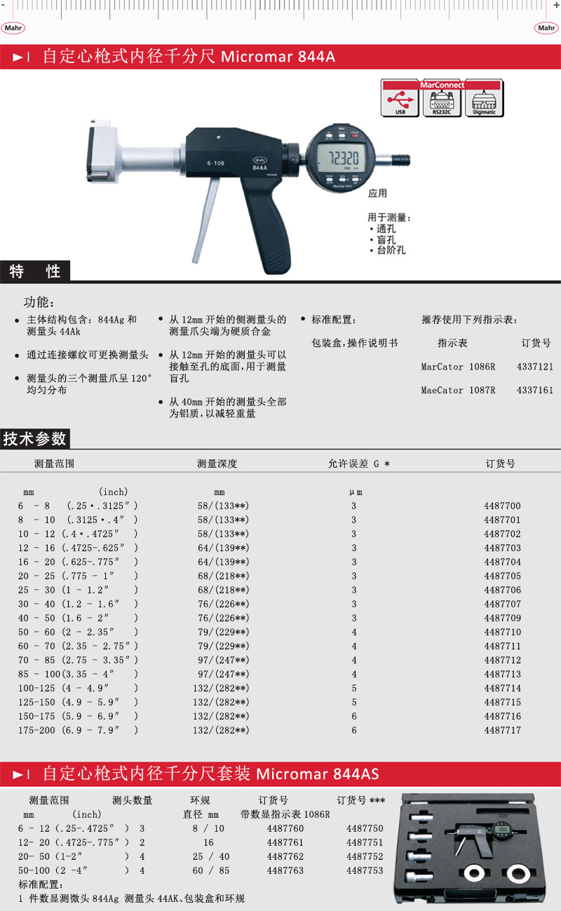- 产品介绍:德国马尔Micromar 844 AS 自定心枪式内径千分尺套装