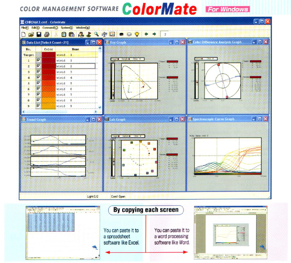 可以显示数据一览表光度曲线表,Lab曲线,Yxy曲线,偏光判定图表,分光反射率数值,以及数字数据等。