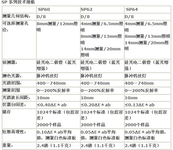 SP60 SP62 SP64 测量几何结构: D/8 D/8 D/8 可选择测量孔径: 8mm测量/12mm照明 4mm测量/6.5mm照明