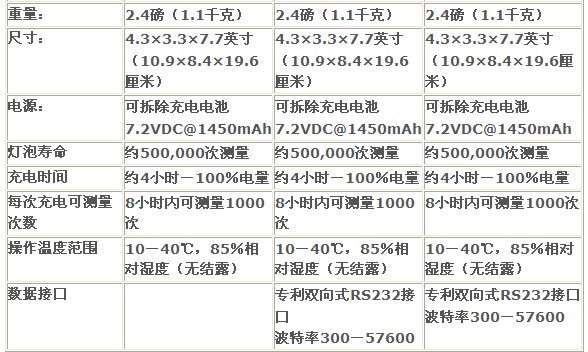 7.2VDC@1450mAh 灯泡寿命 约500,000次测量 约500,000次测量 约500,000次测量 充电时间 约4小时-100%电量 约4小时-100%电量 约4小时-100%电量 每次充电可测量次数 8小时内可测量1000次 8小时内可测量1000次 8小时内可测量1000次 操作温度范围 10-40℃,85%相对湿度(无结露) 10-40℃,85%相对湿度(无结露) 10-40℃,85%相对湿度(无结露) 数据接口 双向式RS232接口
