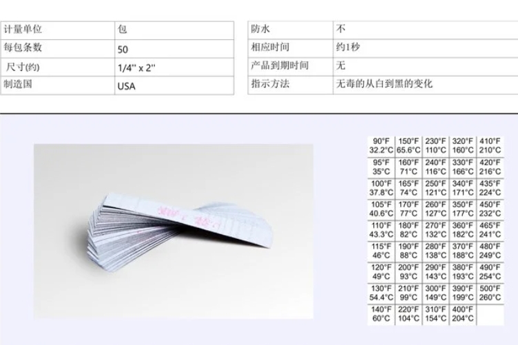 - 产品介绍:板温纸是1/4“ x 2“英寸大小的灰白条,达到合适温度时便会变黑切不可逆,共有43种不同的温度规格可供选择.