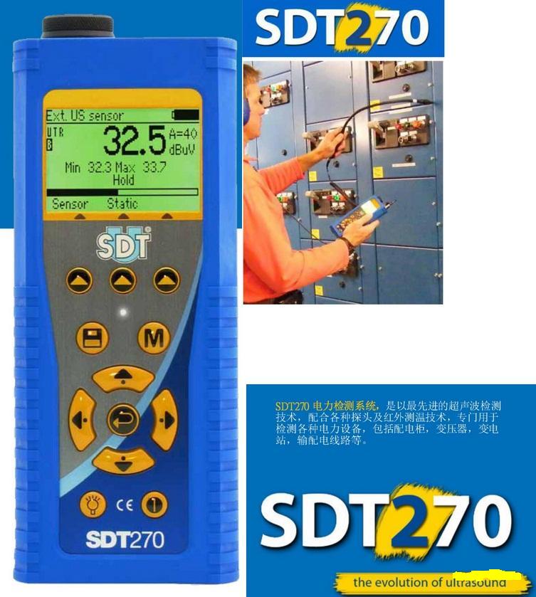 SDT270 为维护及故障检测提供的便携式超声波检测系统 SDT270 是一款创新的超声波检测仪,是超声波检测技术的*。 SDT270 是一台为预防性维护(PDM)设计的便携式超声波检测仪。 系统同时具有内置温度测量和激光转速表测量,以获取温度和转速 数据。SDT270 也是*个包含一个 SQL 数据库的便携式超声波检 测仪,这项功能允许同时收集多类型的检测数据,包括:不同探头 的超声波强度、记录了的超声波音频、温度及转速等数据,创建成 数据库,以便分析。