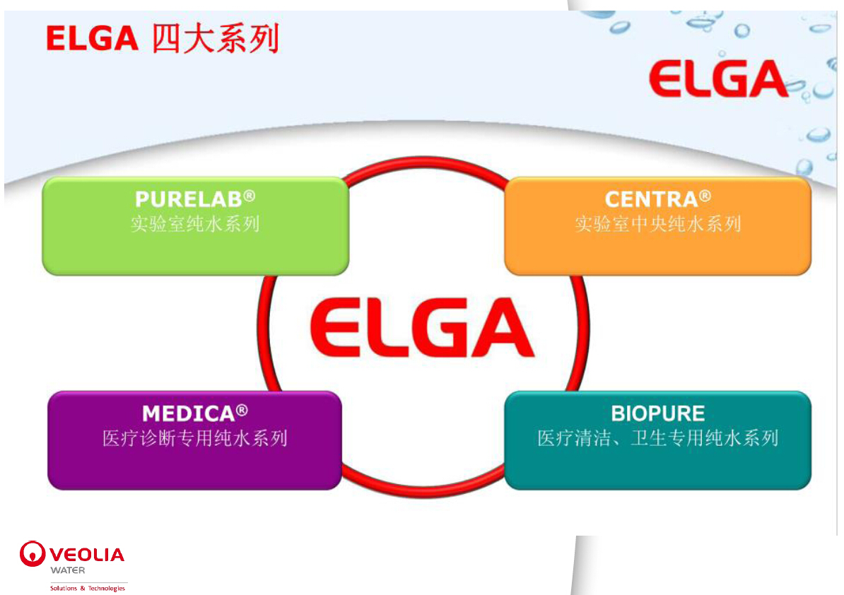 - 产品介绍:ELGA PURELAB超纯水仪•ELGA 推出PureSure 系统(采用了多级监视)及实时TOC 监视方法。•2000•ELGA 成为VEOLIA 的实验室纯水部门。ELGA 推出Option-E5,这是采用连续电流脱盐技术去除水中离子的实验室水纯化系统。•ELGA 推出革命性的CENTRA 系统,这是批量化一体式实验室水纯化系统。•ELGA 推出BIOPU